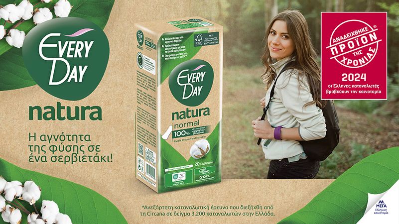 Τα σερβιετάκια EveryDay Natura με κάλυμμα από 100% οργανικό βαμβάκι, εξ ολοκλήρου σχεδιασμό από βιοδιασπώμενα υλικά (απορροφητικός πυρήνας από φυτικές ίνες, αδιάβροχο κάτω κάλυμμα με βάση το άμυλο καλαμποκιού) και 100% ανακυκλώσιμες συσκευασίες, αποτελούν μία ολοκληρωμένη πρόταση υγιεινής που εξασφαλίζει άριστη ισορροπία αποτελεσματικότητας και σεβασμού στο περιβάλλον. Ταυτόχρονα, δίνουν στον καταναλωτή τη δυνατότητα να απολαμβάνει όλα τα οφέλη ενός άριστου προϊόντος ακολουθώντας ορθές περιβαλλοντικές πρακτικές, χωρίς κανέναν συμβιβασμό στην ποιότητα.