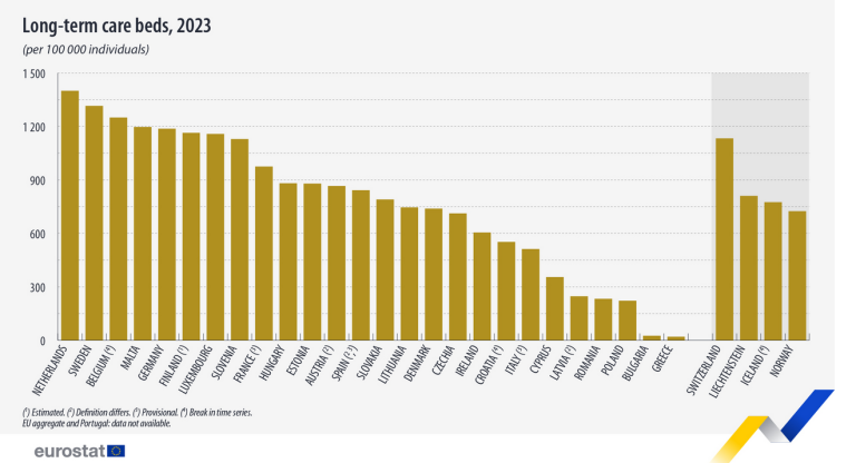Η Ελλάδα καταγράφει την τελευταία θέση της ΕΕ σε κλίνες μακροχρόνιας φροντίδας, με μόλις 20 κλίνες ανά 100.000 κατοίκους το 2023, έναντι 24 το 2013. Τις υψηλότερες τιμές εμφανίζουν η Ολλανδία (1.400), η Σουηδία (1.315) και το Βέλγιο (1.250). Μετά την Ελλάδα ακολουθούν η Βουλγαρία (26) και η Πολωνία (222).
