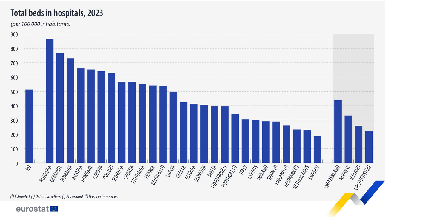 Η Eurostat χαρτογραφεί τις διαθέσιμες κλίνες στα νοσοκομεία της Ευρωπαϊκής Ένωσης, συγκεντρώνοντας τα τελευταία χρόνια συγκριτικά στοιχεία για τους πόρους και τις υπηρεσίες των κρατών-μελών.