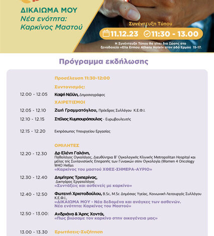 Ο Σύλλογος Καρκινοπαθών, Εθελοντών, Φίλων, Ιατρών «Κ.Ε.Φ.Ι.» Αθηνών διοργανώνει Συνέντευξη Τύπου με θέμα «ΔΙΚΑΙΩΜΑ ΜΟΥ: Τα δικαιώματα των ασθενών με καρκίνο. Νέα ενότητα: Καρκίνος Μαστού», η οποία θα πραγματοποιηθεί τη Δευτέρα 11 Δεκεμβρίου 2023 και ώρα 11:30 – 13:00. Η Συνέντευξη Τύπου θα γίνει δια ζώσης στο ξενοδοχείο «Elia Ermou Athens Hotel» στην οδό Ερμού 15-17, ενώ θα μεταδοθεί με live streaming από το facebook του συλλόγου https://www.facebook.com/skkefi/.
