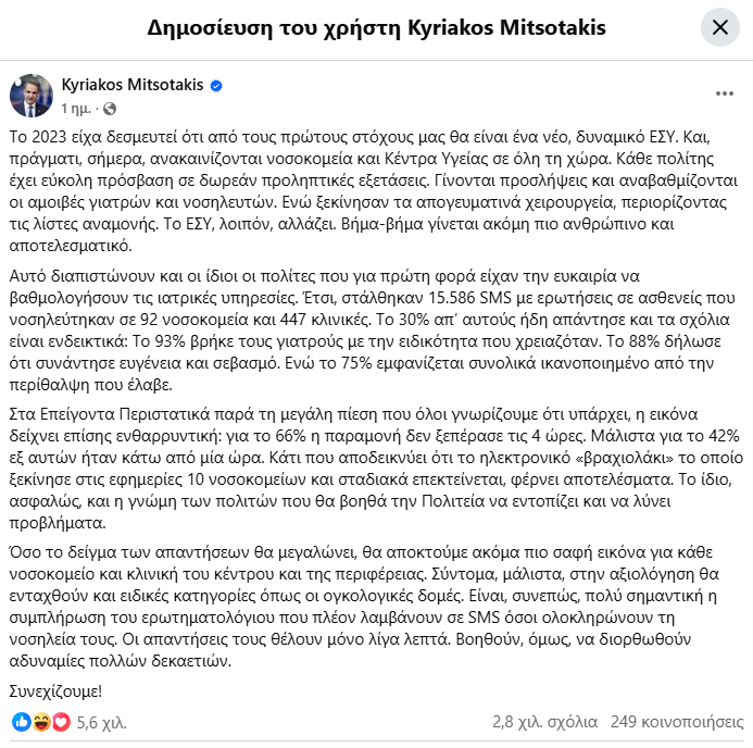 Με ανάρτησή του στα κοινωνικά δίκτυα, ο πρωθυπουργός Κυριάκος Μητσοτάκης παρουσίασε τα πρώτα αποτελέσματα από την αξιολόγηση του ΕΣΥ, όπως αυτά καταγράφηκαν από τους πολίτες.