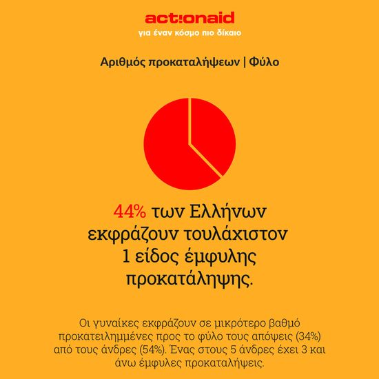 Ειδικότερα για το εύρημα του πλήθους των ανθρώπων με έμφυλες προκαταλήψεις, το 54% των ανδρών έχουν τουλάχιστον μία προκατάληψη, ενώ το αντίστοιχο ποσοστό για τις γυναίκες ανέρχεται στο 34%. Σημειώνεται ότι 1 στους 5 άνδρες έχει τουλάχιστον 3 προκαταλήψεις.