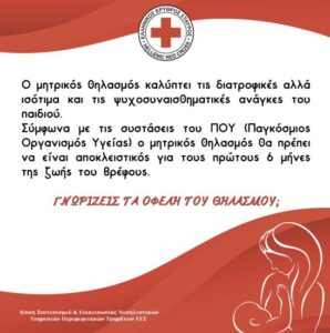 Ο Ελληνικός Ερυθρός Σταυρός συμμετέχει στις δράσεις για την Παγκόσμια Εβδομάδα Μητρικού Θηλασμού (1-7 Νοεμβρίου),  στοχεύοντας στην ενημέρωση του κοινού για την τεράστια αξία του μητρικού θηλασμού, ο οποίος, σύμφωνα με τις συστάσεις του ΠΟΥ (Παγκόσμιος Οργανισμός Υγείας), θα πρέπει να είναι αποκλειστικός για τους πρώτους 6 μήνες της ζωής του βρέφους.