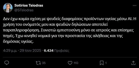 «Δεν έχω καμία σχέση με ψευδείς διαφημίσεις προϊόντων υγείας μέσω ΑΙ. Η χρήση του ονόματός μου και ψευδών δηλώσεων αποτελεί παραπληροφόρηση. Συνιστώ εμπιστοσύνη μόνο σε ιατρούς και επίσημες πηγές. Έχω κινηθεί νομικά για την προστασία της αλήθειας και της δημόσιας υγείας».