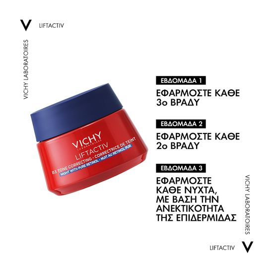 Η Vichy, η μάρκα που συνιστάται από 70.000 δερματολόγους παγκοσμίως, παρουσιάζει τη νέα κρέμα νύχτας Liftactiv B3 Specialist, με υψηλή περιεκτικότητα σε έναν πανίσχυρο συνδυασμό Νιασιναμίδης (βιταμίνη Β3) και καθαρής Ρετινόλης, που καταπολεμά τις κηλίδες, μειώνει τις ρυτίδες και βελτιώνει την ομοιομορφία του τόνου της επιδερμίδας κατά τη διάρκεια της νύχτας.
